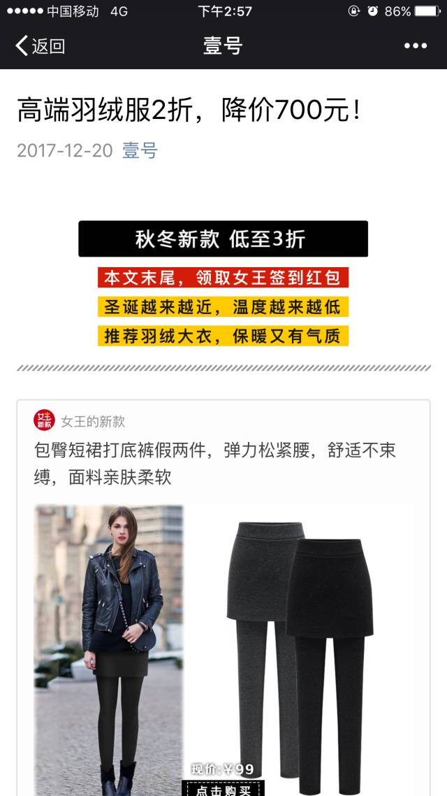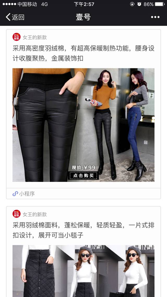 图文消息结合小程序或许是企业重要的变现方式。再拿女王的新款来举例,其小程序关联了200+分享女性服装的公众号。公众号的长期运营解决信任和流量的问题,图文消息+小程序解决成交和微信裂变的问题。